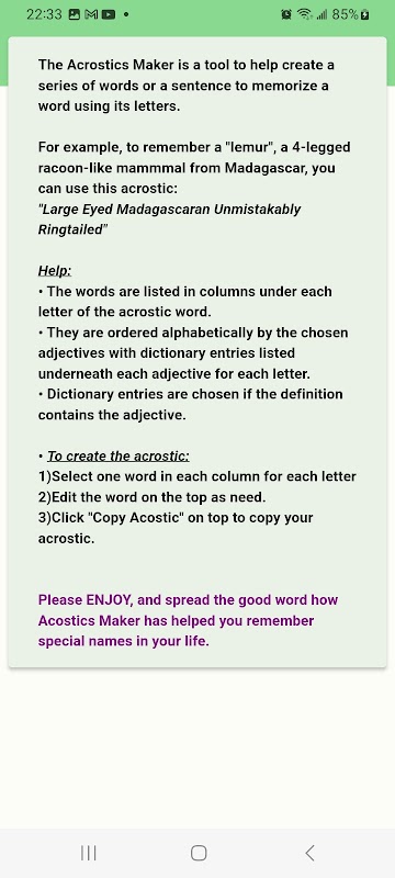 Acrostics maker is a tool to help create acrostics for names such that names themselves become acronyms. It is useful for remembering the key qualities of things.