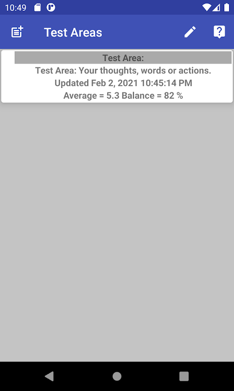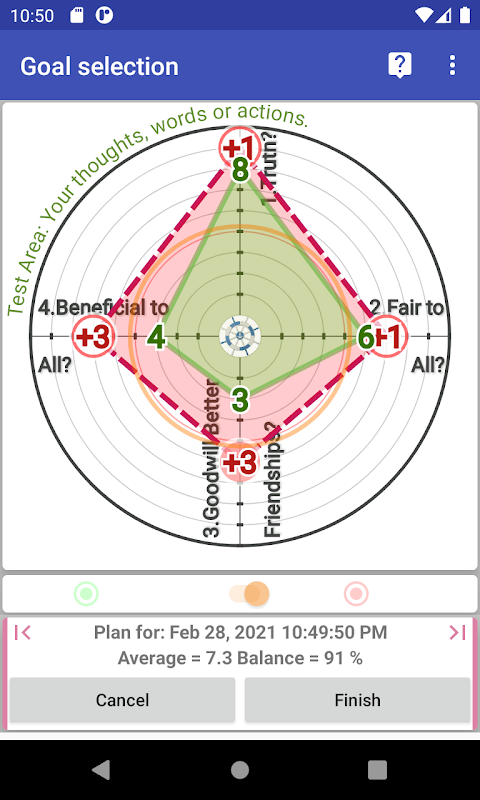 With an extended assessment of the area on a 10-point scale, it is not possible to fully take this area into account in your activities, but it can and should be taken into account to a greater or lesser extent, in proportion to the Level and Balance of all values of answers to the Test questions, where the Test Level shows the average value of all values of answers to test questions, and the Test Balance shows the deviation of the values of answers to Test questions from the Test Level. If the Test Level is greater than 5, then the Conditional Significance tends to become fully significant over time, so it makes sense to consider such an area to a greater extent, subject to further observation. If the Test Level is equal to or less than 5, then it is better not to take into account such an area in the activity at the moment, but it is advisable to observe it over time, since in the future its Test Level may increase and then it can give additional potential. Not all good ideas are taken straight away, but over time they can become meaningful. In the extended Test, now, you can check it on your problems. In this application, the Wheel of Balance of Test Questions is used, which allows you to immediately see the Level and Balance of the Test after answering questions on a 10-point scale, to observe in time the changes in your assessments of the studied area and its tendency to full significance or complete insignificance for your activity. In the application, you can explore an unlimited number of research areas, remember all changes by dates, set goals to achieve the significance of each research area, if it depends on you, and track the timing of their completion.Expanded use of the test also allows you to explore areas in time in which you are currently absolutely confident and guided by them in your activities.