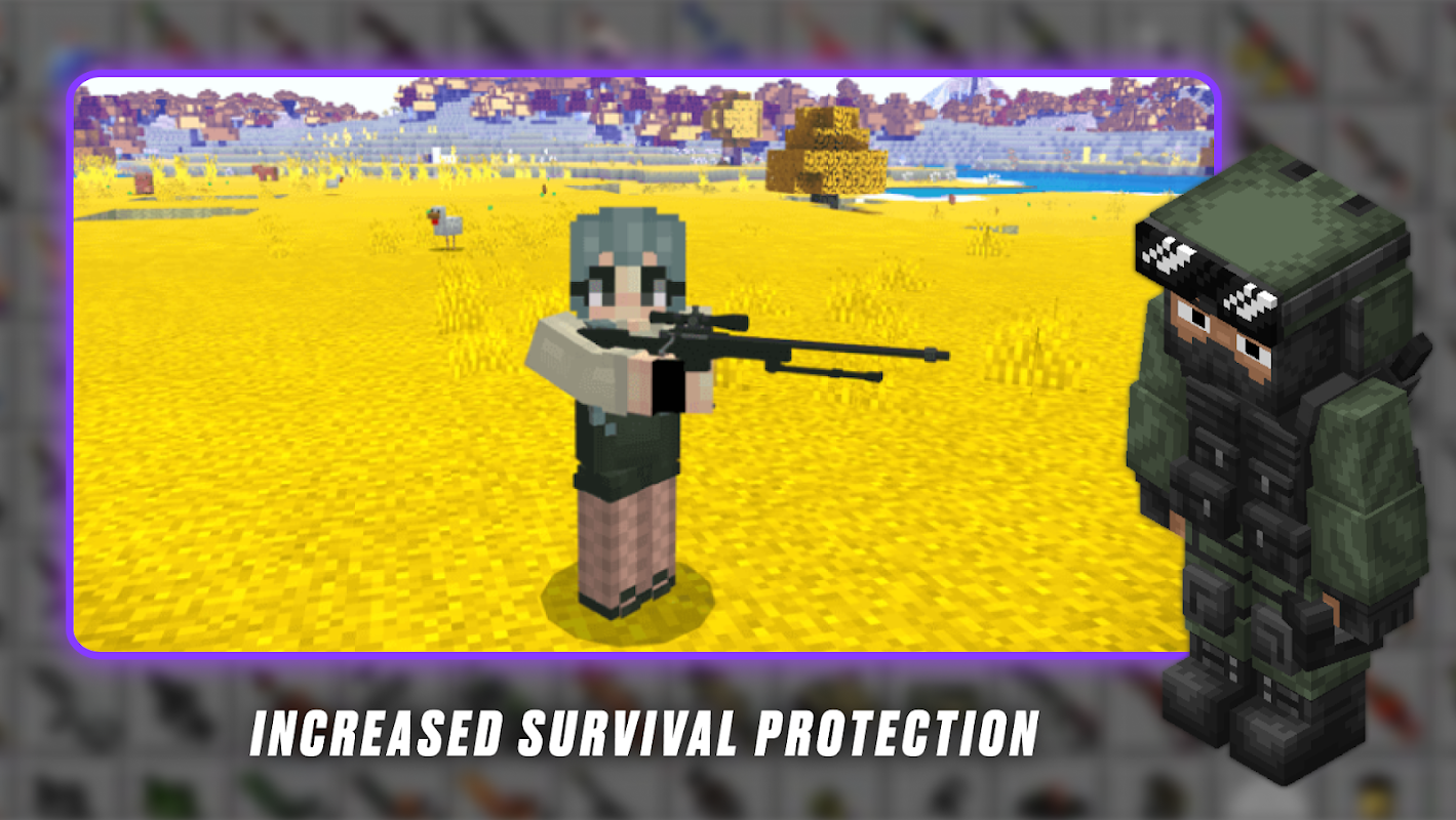 In a world where survival is an art and every fight requires skill and training, an application called Actual Guns: Weapons Minecraft provides everything you need to become a true warrior. Addons for games allow players to master the use of different types of Guns & Weapons Mod for MCPE Bedrock, each with unique characteristics and designed for specific tactics. Thanks to Gun Mod for Minecraft App 2024 game is enriched with models of guns and armor, making each battle even more exciting and realistic.