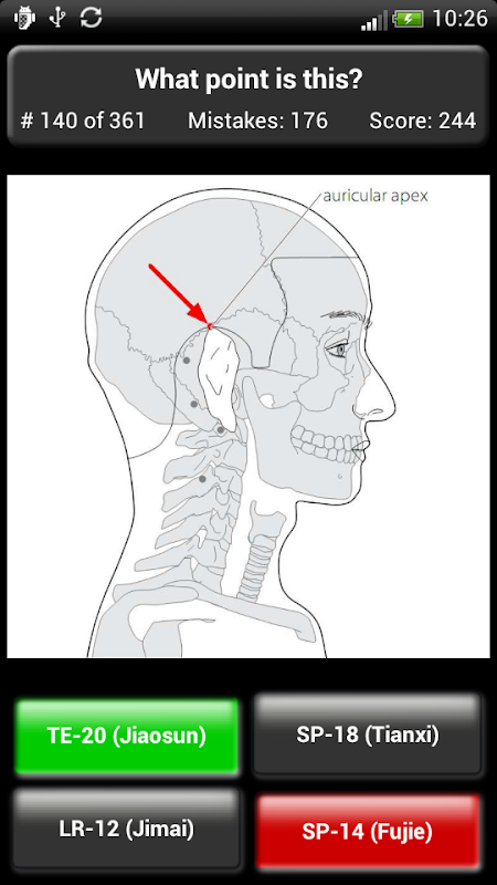 Each question has 4 possible answers. When you tap one of the answers, the default color of the pressed button is changed for a while to green (when it was the right answer) or to red (wrong answer). You have 3 attempts to give right answer. If you give it at the first attempt you will receive 3 points, at the second attempt - 2 points, at the third - 1 point. Play the "Acupuncture Points Quiz" now to test and improve your knowledge of the acupuncture points!