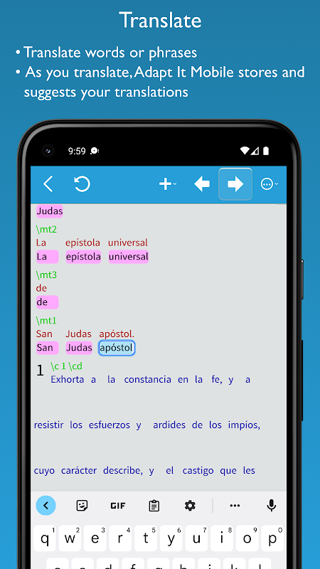 Adapt It Mobile is a simple related language translation editor designed for mobile devices. Using a tablet or smartphone, you can use Adapt It Mobile to quickly translate text from one language to another related language. Previous translations are stored in a translation memory called a Knowledge Base, and are suggested the next time that particular word or phrase is encountered.