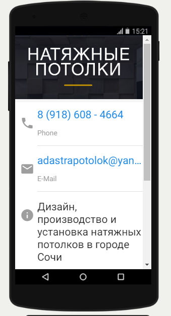 «Адастра Сочи» специализируется на производстве, монтаже и ремонте натяжных потолков в городе Сочи с 2010 года. Клиентами нашей компании за время работы на курорте становились как крупные заказчики (санатории, развлекательные центры), так и рядовые сочинцы и гости курорта. Нашу продукцию отличает абсолютный баланс в соотношении «цена-качество». Безопасность полотен натяжных потолков подтверждена всеми необходимыми сертификатами - проводим работы и выполняем заказы даже в детских садах. Работаем по всему Сочи