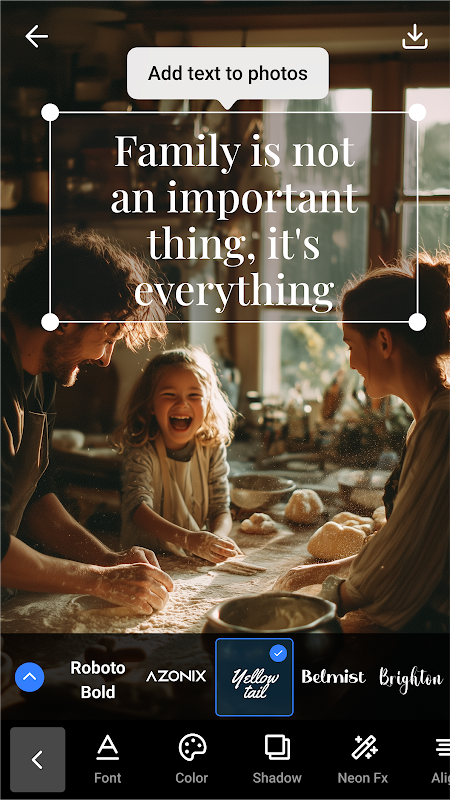 This app is more than just a photo editor text tool. It’s your go-to for turning memories into shareable text pictures. From text on pictures to text photo creations, make every moment special. With Text On Photo, your text art will shine. It's the easiest way to add text on photos for free and create text picture magic.