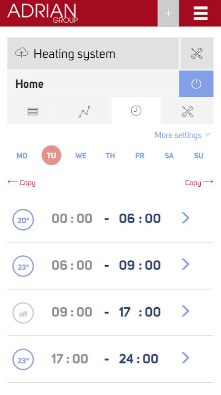 ADRIAN®smart allows you to control all heating devices in your premises, set individual schedules for them and monitor the temperature in real time. You can monitor their work via Internet through your PC or smartphone.