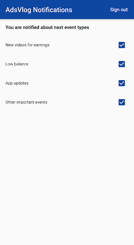 Install this app if you want to receive notifications about new videos for earn by watching, low balance of your account, updates and other important information.