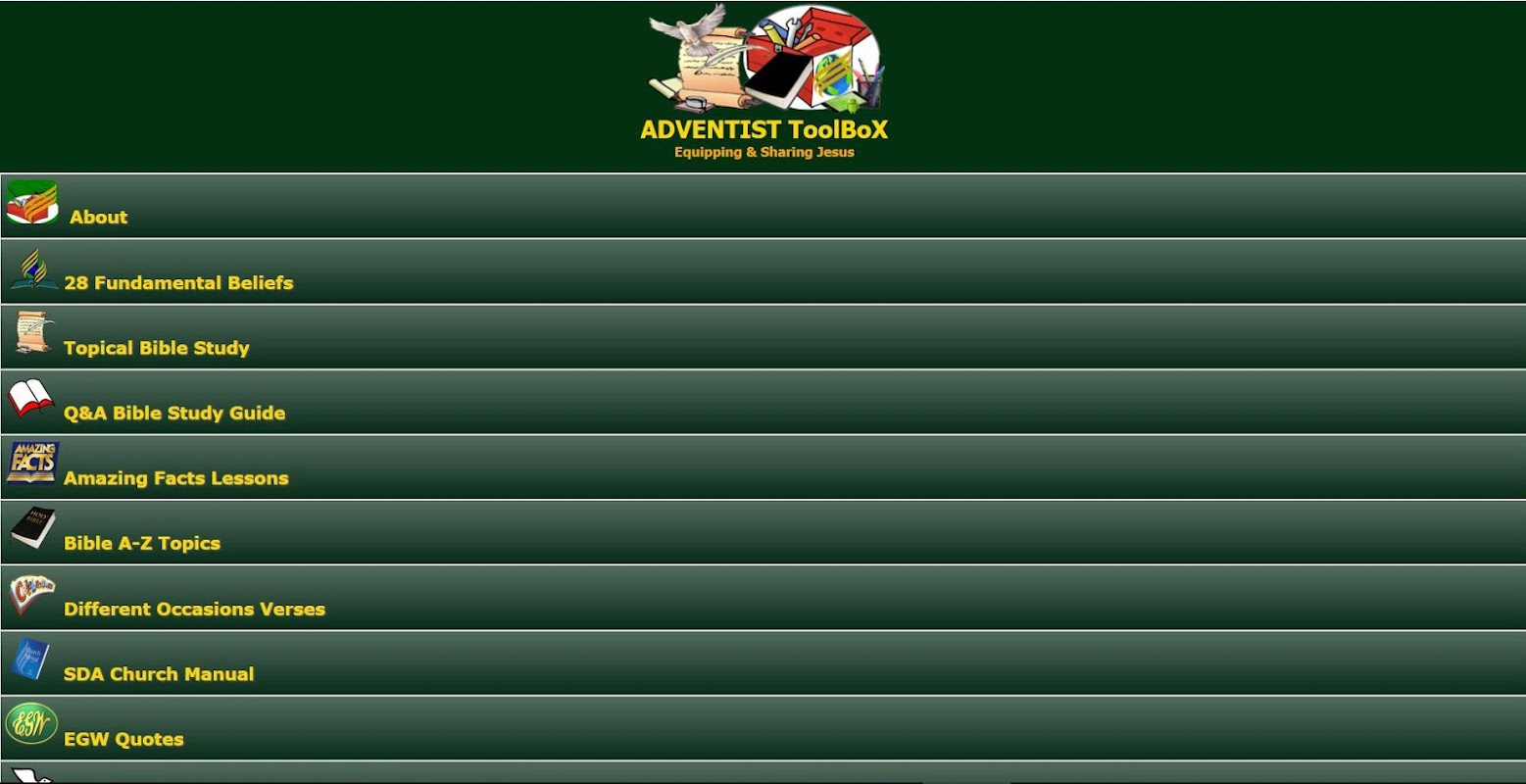 Adventist Toolbox is the best Adventist evangelism and spiritual revival materials offline. If you are a missionary, church elder, youth leader, pastor, layman and active church member in a country with bad internet connection, you must have this app to help you in your teaching, sharing and preaching.