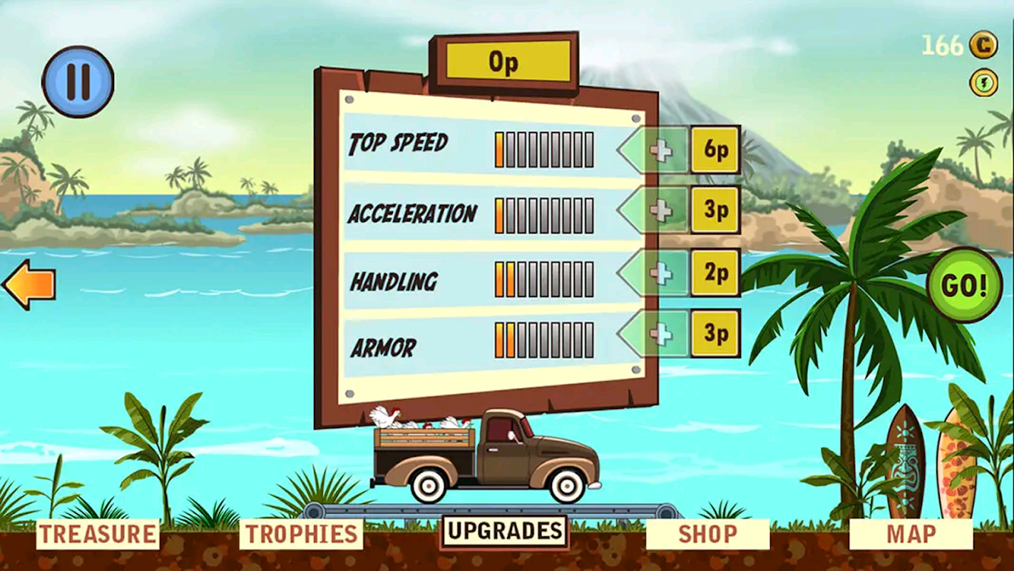 On a tropical island far away, a once-in-a-lifetime adventure is waiting for you! Compete in a crazy 2D car race for fame, glory and treasures! You start with an old hippie minibus which is reliable, but slow.