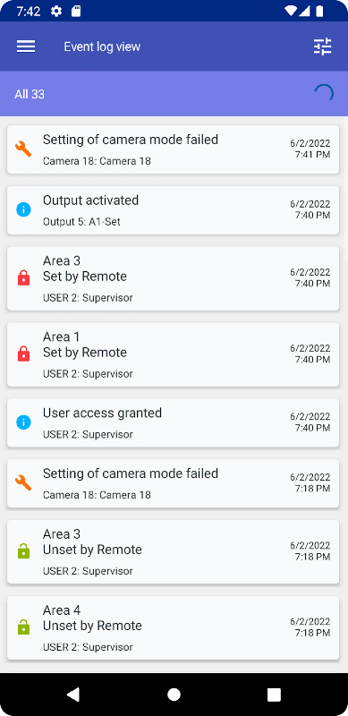 To consult the history of the events you can easily swipe to the event log page and scroll through the event list and check for example who armed the system at what time or when a door was opened to provide access to a specific user.