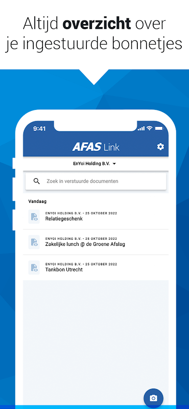 AFAS Link is volledig geïntegreerd met AFAS SB. In deze app maak je gemakkelijk een foto van je bon of upload je je factuur. Deze stuur je daarmee direct naar je accountant. Lekker makkelijk!