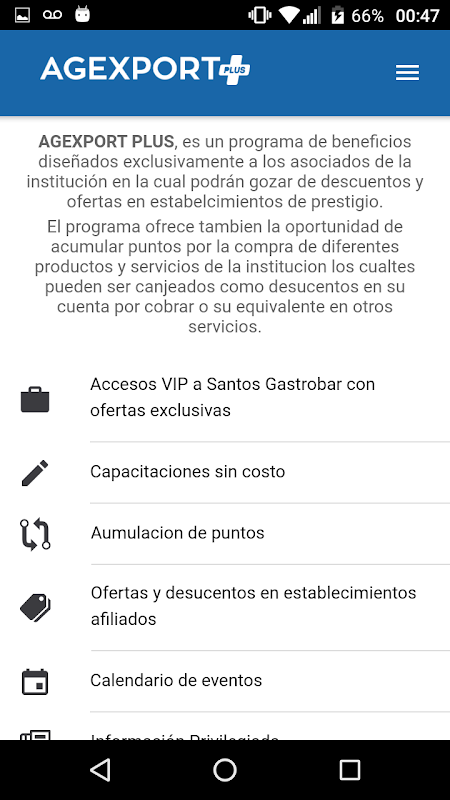 AGEXPORT PLUS es un programa de beneficios diseñados exclusivamente a los asociados de la institución en la cual podrán gozar de descuentos y ofertas en establecimientos de prestigio.