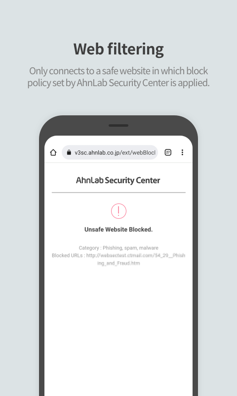 • Web filtering: Only connects to a safe website in which block policy set by AhnLab Security Center is applied.
