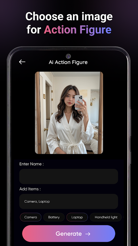 Upload a photo or short clip of your action figure, and let the app intelligently analyze the pose, structure, and details. Using advanced motion-mapping AI, it brings your figure to life with realistic movements, gestures, and expressions.
