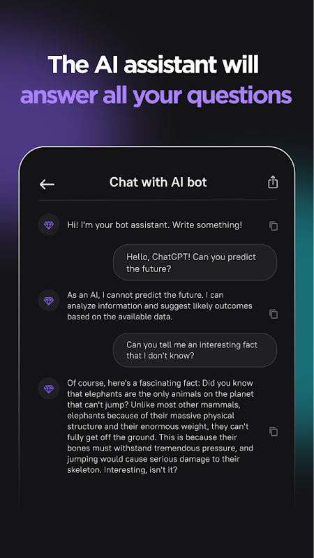 "AI ChatGPT - AI Bot Helper" understands and responds to many different topics, and its use of GPT3.5 and GPT4 technologies facilitates this. It will help you solve complex problems, wow your friends with new rap lyrics, automate code writing and even come up with new recipes for your culinary experiments.