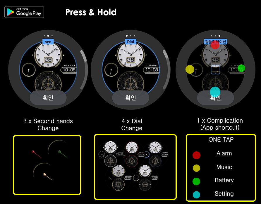 - one tap (Alarm, Music, Battery, Setting)