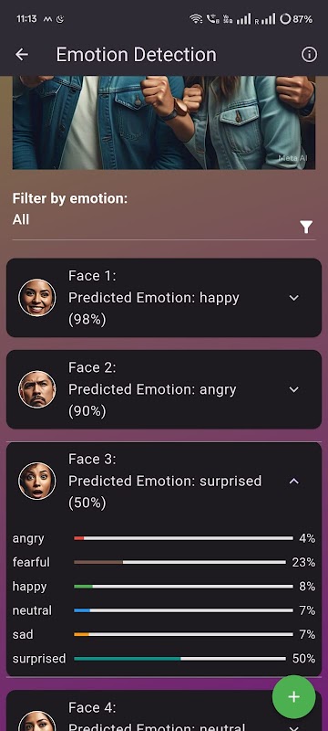 Interactive visual gauges display the confidence level of each detected emotion.