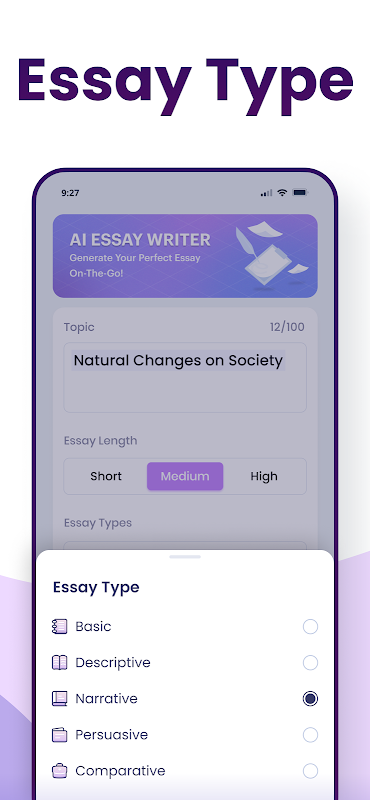 Another feature that stands out our app among essay writing solutions, is its capability to generate different types of essays. It allows users to generate Basic, Descriptive, Comparative, Narrative, Persuasive, and Academic essays.