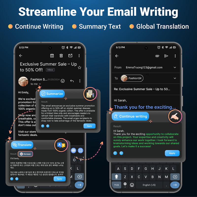 🌐 Global Translation for Business: When working with clients or friends globally, AI Keyboard eliminates language barriers.