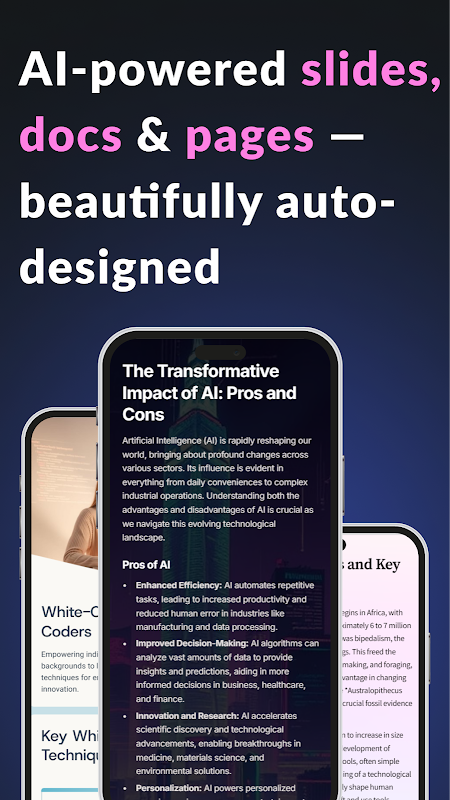 Create stunning presentations, pitch decks, reports, and slides in seconds — powered by AI.