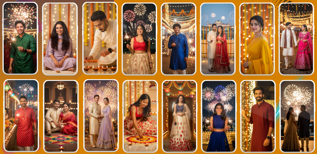 Diwali Special – Celebrate the festival of lights with prompts inspired by Diwali traditions, glowing diyas, sparkling firecrackers, rangoli patterns, festive outfits, illuminated homes, and a joyful family atmosphere. Perfect for men, women, and couples looking for vibrant, cultural, and festive photo ideas.