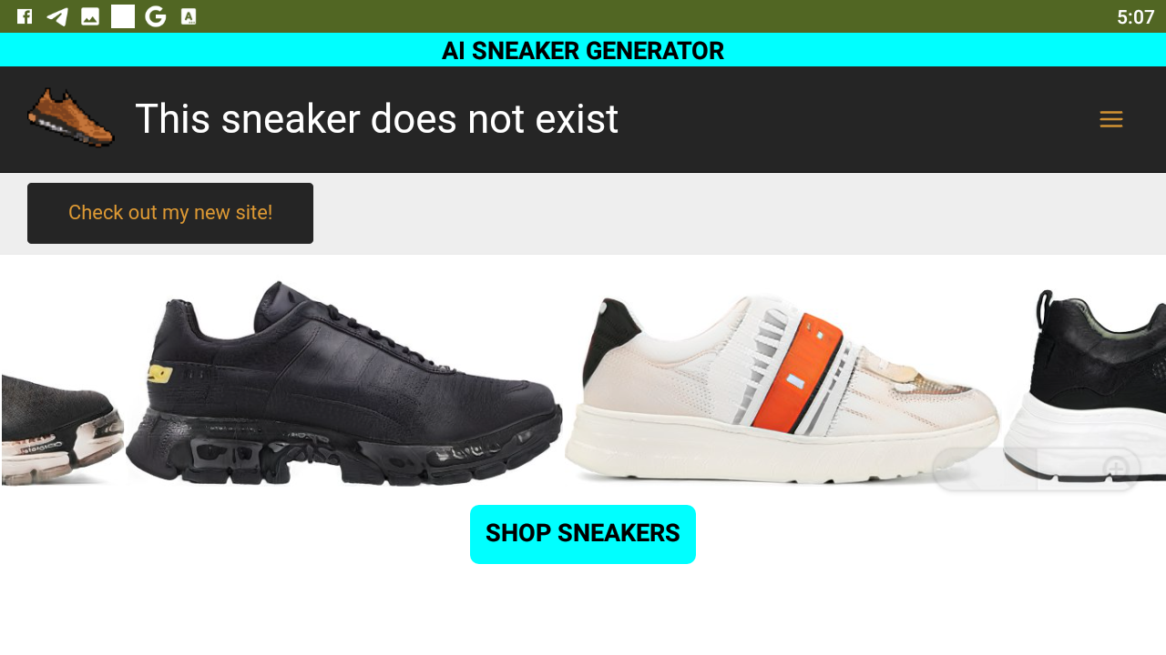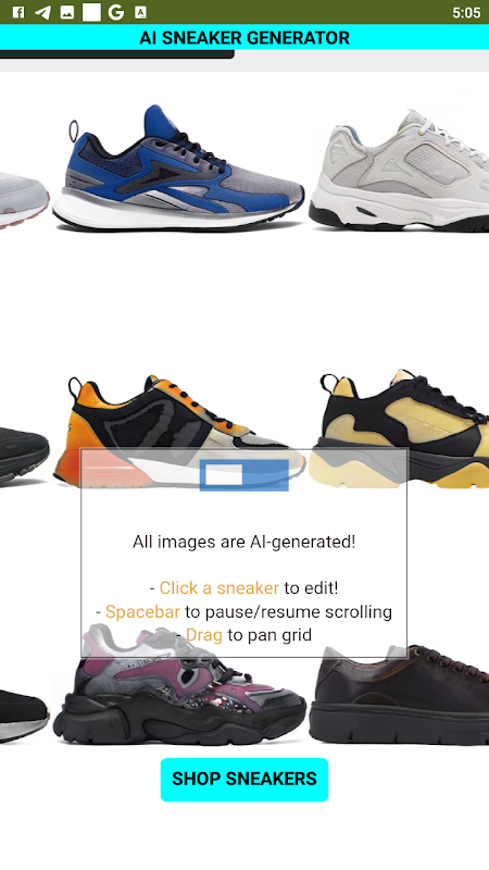 AI Sneaker Generator is a artificial intelligence app that generates sneakers. This app displays a grid of AI-generated sneakers portraits. Each sneaker is uniquely made by AI, therefore unique in it's entirety and you get to edit each sneaker the way to want with the editor tab.