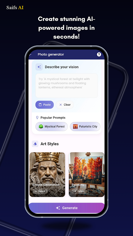 • How it works: Simply describe what you want to see, and SaifsAI generates a unique image