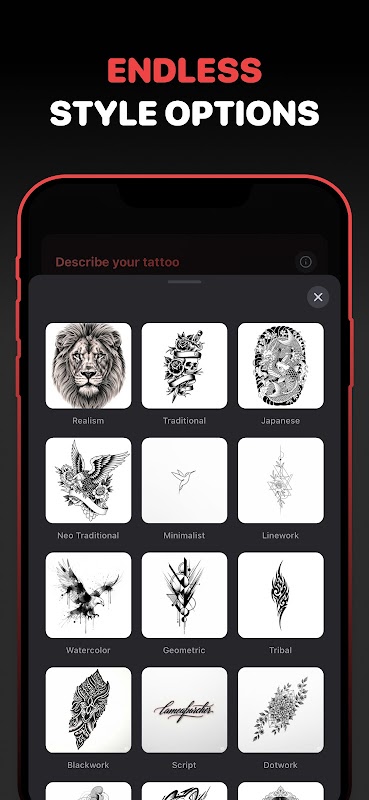 • Explore endless tattoo styles: tribal, sleeve, geometric, watercolor, blackwork