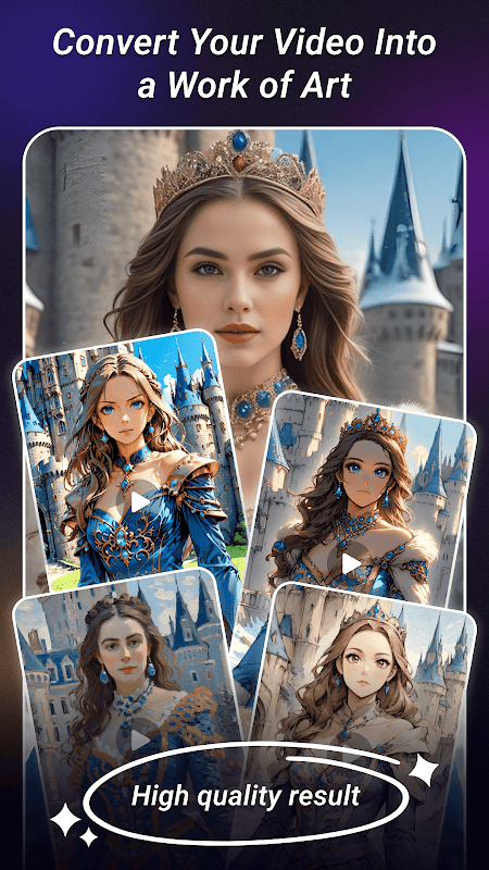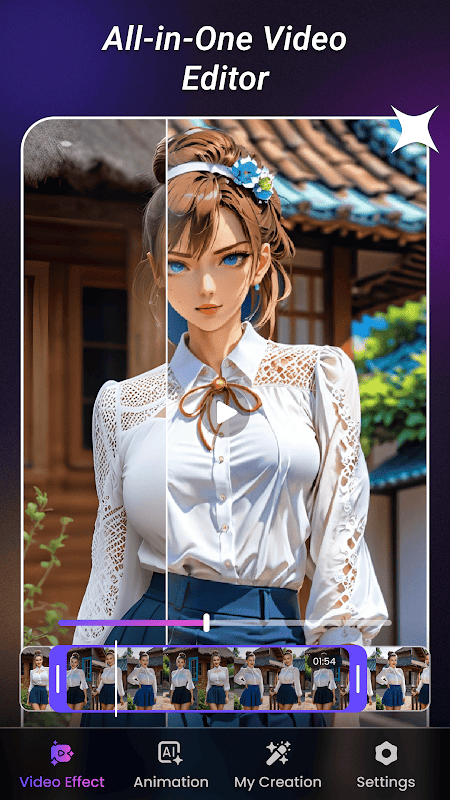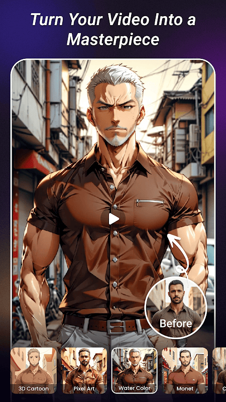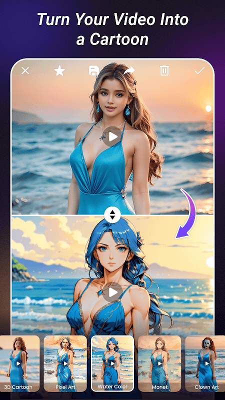 AI Video Editor app is a powerful and user-friendly tool that allows you to effortlessly transform your videos into visually stunning creations using advanced AI techniques. Whether you want to turn your clips into a cartoon, epic manga, watercolor painting, or other artistic styles, the AI Video Maker app offers a wide variety of trendy video templates to choose from. With its simple three-step process—just select a video from your gallery, choose your favorite effect, and tap the generate button—you can create impressive video edits in seconds, with no technical skills required.