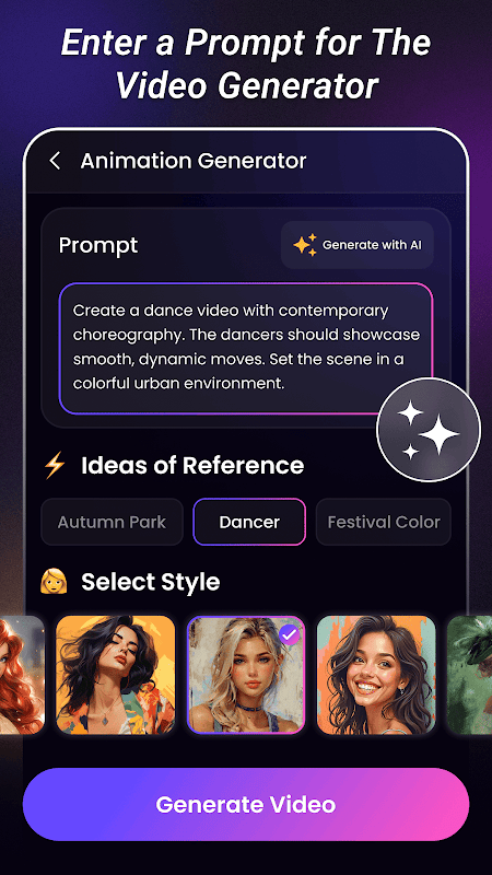 AI Video Editor also features an innovative animation generator tool that lets you turn your creative ideas into animated visuals. Just enter a prompt or theme like "autumn park," "mountains," or "festival colors," pick a preferred art style, and the AI brings your vision to life with a single tap. All your generated videos and animations are conveniently saved in the app’s gallery, making it easy to view, organize, and share your creations with friends, family, or social media followers.