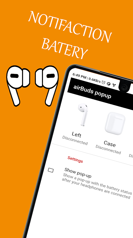 - Shows an airPod battery popup on Android and losted airpod and airbuds when the AirPods is connected.