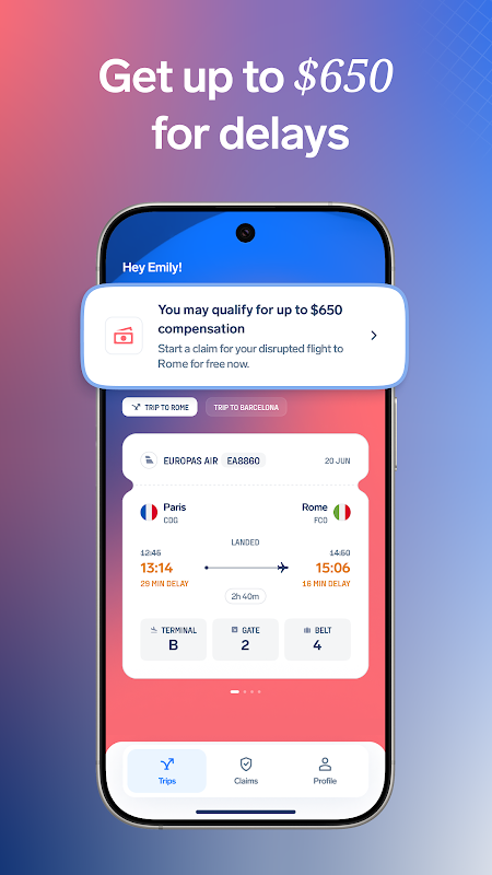 If you’ve experienced a delayed flight, cancelled flight, or overbooking, you could be eligible for compensation of up to $600. Use the app to check your eligibility and submit a claim in just a few taps. AirHelp takes care of the rest, so you can focus on your journey. No paperwork, no hassle – just a faster way to claim what you're owed.