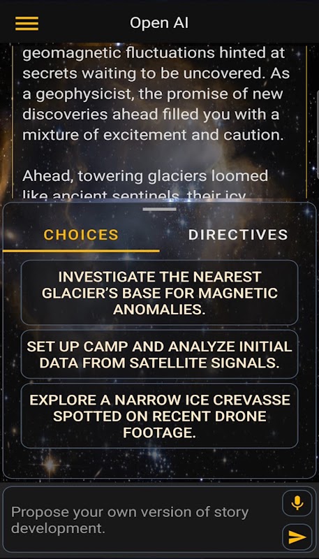 • Choose from predefined stories or create custom adventures with a single prompt (type or use voice input)