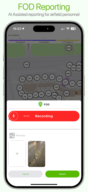Issue Reporting: All personnel auhtorized to on the airfield can use Airside to report FOD and many other safety & maintenance issues. Users simply submit an issue by talking to Airside AI, and optionally upload a photo. This instantly alerts the relevant department to address the issue, and as required ATC to issue a NOTAM, close a section of the airfield, or close a runway until the issue is resolved