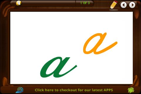 This App is designed to make the English learning more a game than a boring writing exercise. Facility to control the levels can be beneficial to the user in that, it can be set according to his/her expertise. The audio-visual elements combined with the finger gesture, makes this a welcome replacement to the traditional character learning system.