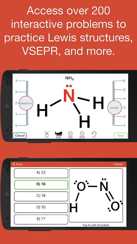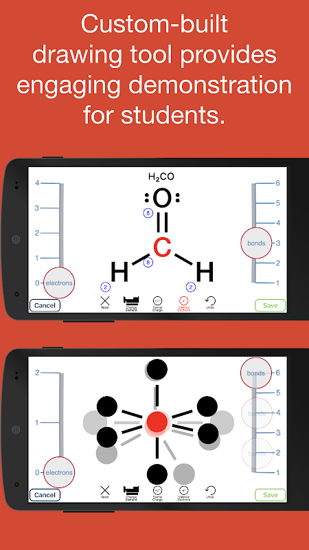 • Intuitive Lewis structures drawing tool built specifically for mobile devices - Use as engaging demonstration for your students to show example Lewis structures and reinforce concepts such as the octet rule, formal charge, and VSEPR. Students can take advantage of the drawing tool to visualize the relationship between Lewis structures and molecular shapes.