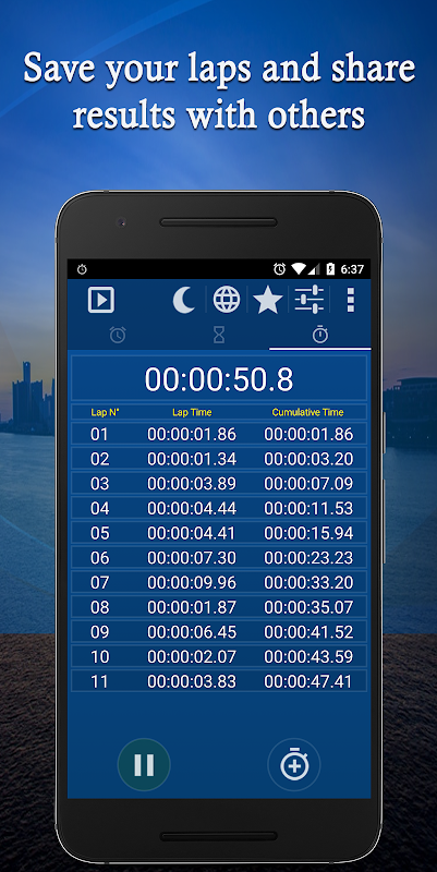 Stopwatch: You can record laps, share the results or save them on SD card with a simple click or import them with a long click.