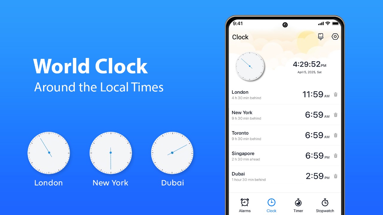 - World Clock: Stay connected globally by keeping track of time across different time zones. Ideal for travellers and those coordinating with people worldwide.