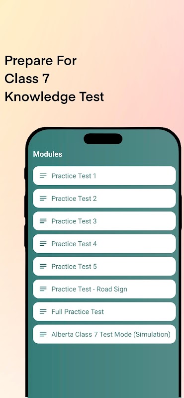 📝 Modules 1 to 5 offer Practice Tests 1 to 5, each packed meticulously crafted questions to simulate the real exam environment. Test your understanding of Alberta traffic rules, road signs, and safe driving practices to breeze through the actual test!