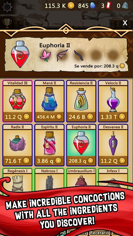 ● A gallery in the form of a recipe book, so you can enjoy all the potions you craft through your adventure whenever you want.