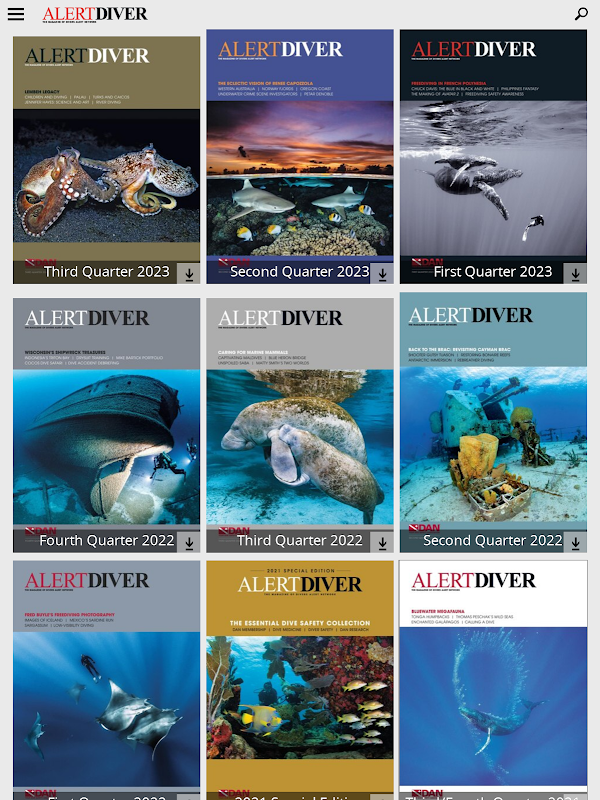 Published quarterly, Alert Diver is a benefit to members of DAN; its companion website, AlertDiver.com, is available to all. If you are a current DAN member (DAN America region), everything offered in this app is included in your membership and free to you!