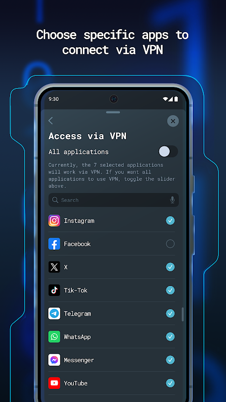 ➜ Implemented the ability to select specific applications to connect to the VPN.