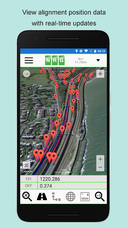 Perfect for placing on your vehicle dashboard NRG Alignment Viewer landscape mode provides clear and real-time updates to the device position in terms of WGS84, Cartesian EN and Geometric Alignment (Chainage/Station/Meterage) coordinates.