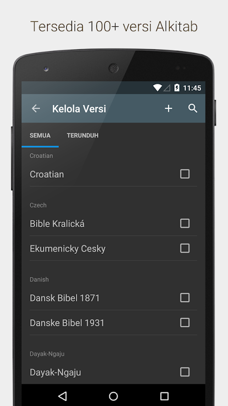 Various translations of the Bible. There are various versions of Bible translations in Indonesian and regional/ethnic languages, the original language of the Bible (Greek/Hebrew), and other foreign languages. It only needs to be downloaded once, after that it can be read offline.