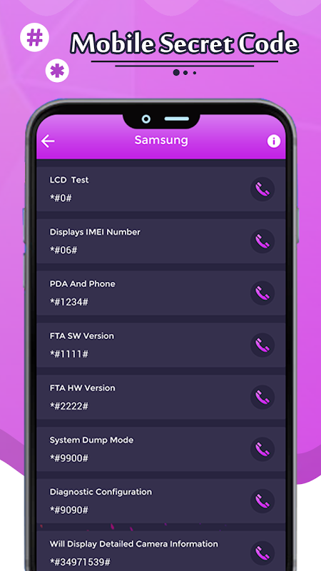 All Mobile Secret Codes - MMI USSD application with also allow facilities to copy code or direct paste it into the dial pad. Now discover all devices USSD code with one tap through this application. The secret codes can also be used for gaining access to the android services. Now easy to check all common secret codes of including IMEI Number, Network test, Bluetooth test, Hardware version, Machine test, Test backlights or also Vibrations. Other codes information like About Phone, Battery, Camera, Changing Power button behavior, Display WIFI mac address, Check software version, etc