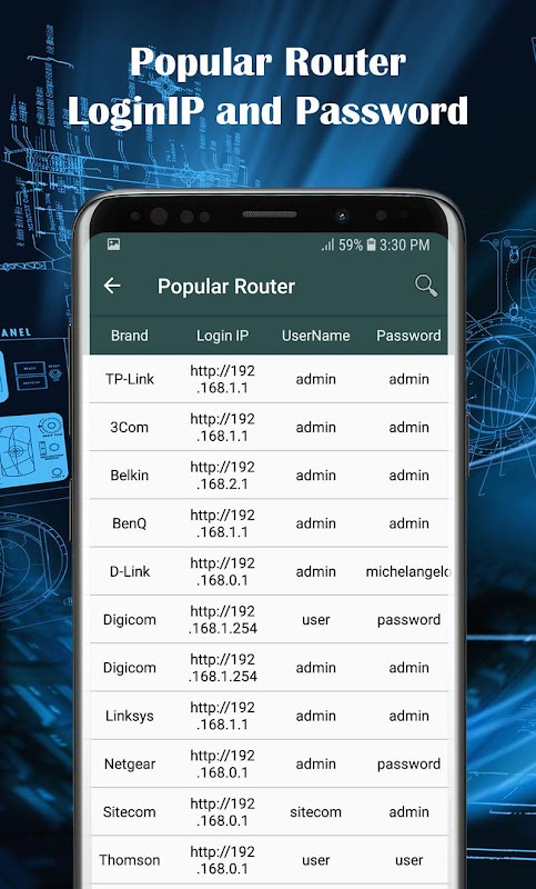 With application All Router Admin - Wifi password manager, You can find admin password of over 3000 popular wifi routers. It helps you easy to access and settings your wifi router. You can see your wifi password and change your wifi password. You can also block someone from accessing your wifi.