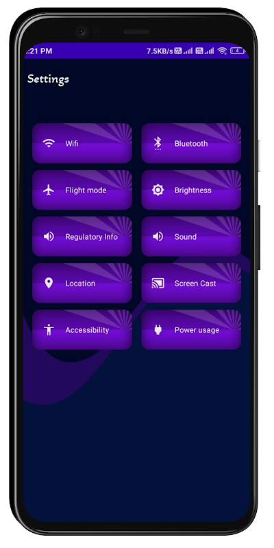 This phone Settings app provides easy access for your android device settings. First two categories provide common system settings like volume control or manage and screencast and most used settings like Bluetooth and flight mode shortcut and many others like power usage.