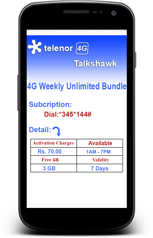 Telenor 3G 4G package contains details of the following packages