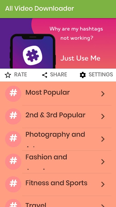 This is not just , Our App supports upto 56 websites😲 to download content from all social media platforms e,g Tiktok, Roposo, Likee, Sharechat, Instagram, Facebook etc.Interesting part is this that you can even increase your followers😲 with our Hashtag Generator and can become popular😎 , and talking about the languages Our App supports 7 languages So that you can choose your desired languages😇, So just download our App enjoy All features🙃