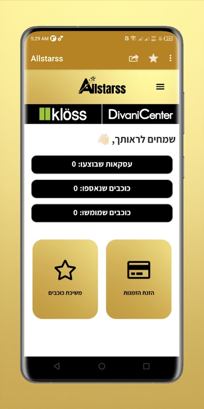 ברוך הבא ל-ALLSTARS מערכת לניהול אדריכלים ומעצבים. בממשק תוכלו לעקוב אחרי הזמנותיכם, יתרות התשלומים שלכם, לצבור כוכבים ולהנות ממתנות שוות.