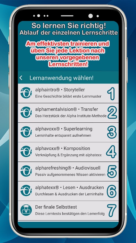 This mobile learning variant is also based on the learning phases of the successful and award-winning Alpha Institute method and guarantees you maximum learning success.