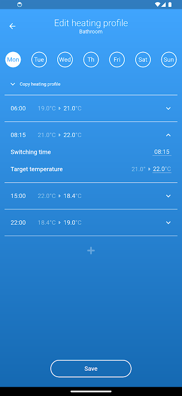 • Heating profiles can be programmed to allow temperature settings depending on the day and time